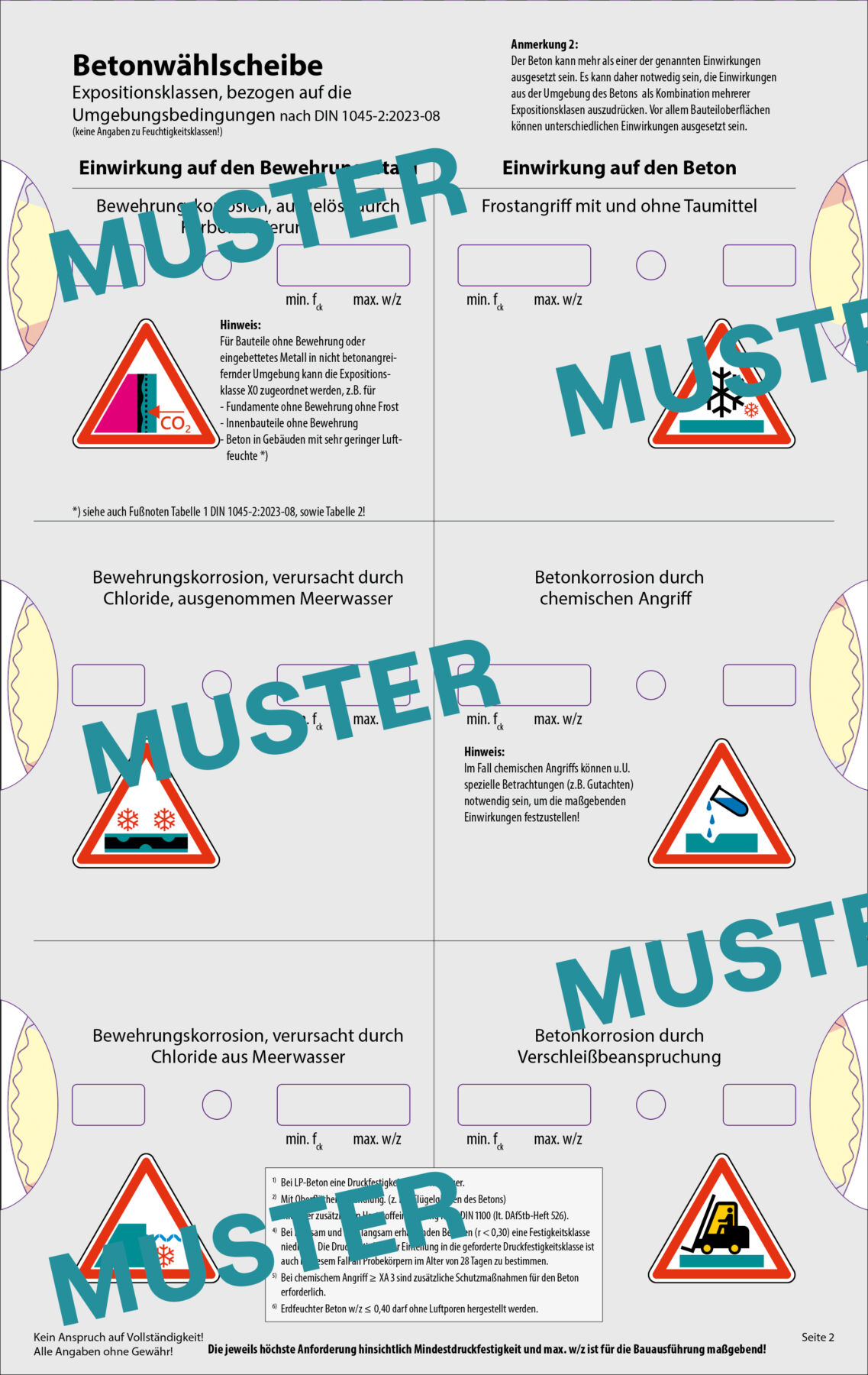 Kombinieren Sie über das Drehen der Wählscheiben schnell und einfach die planerische Umgebungsbedingung des Betons mit der richtigen Expositionsklasse, Mindestdruckfestigkeit und W/Z-Wert.