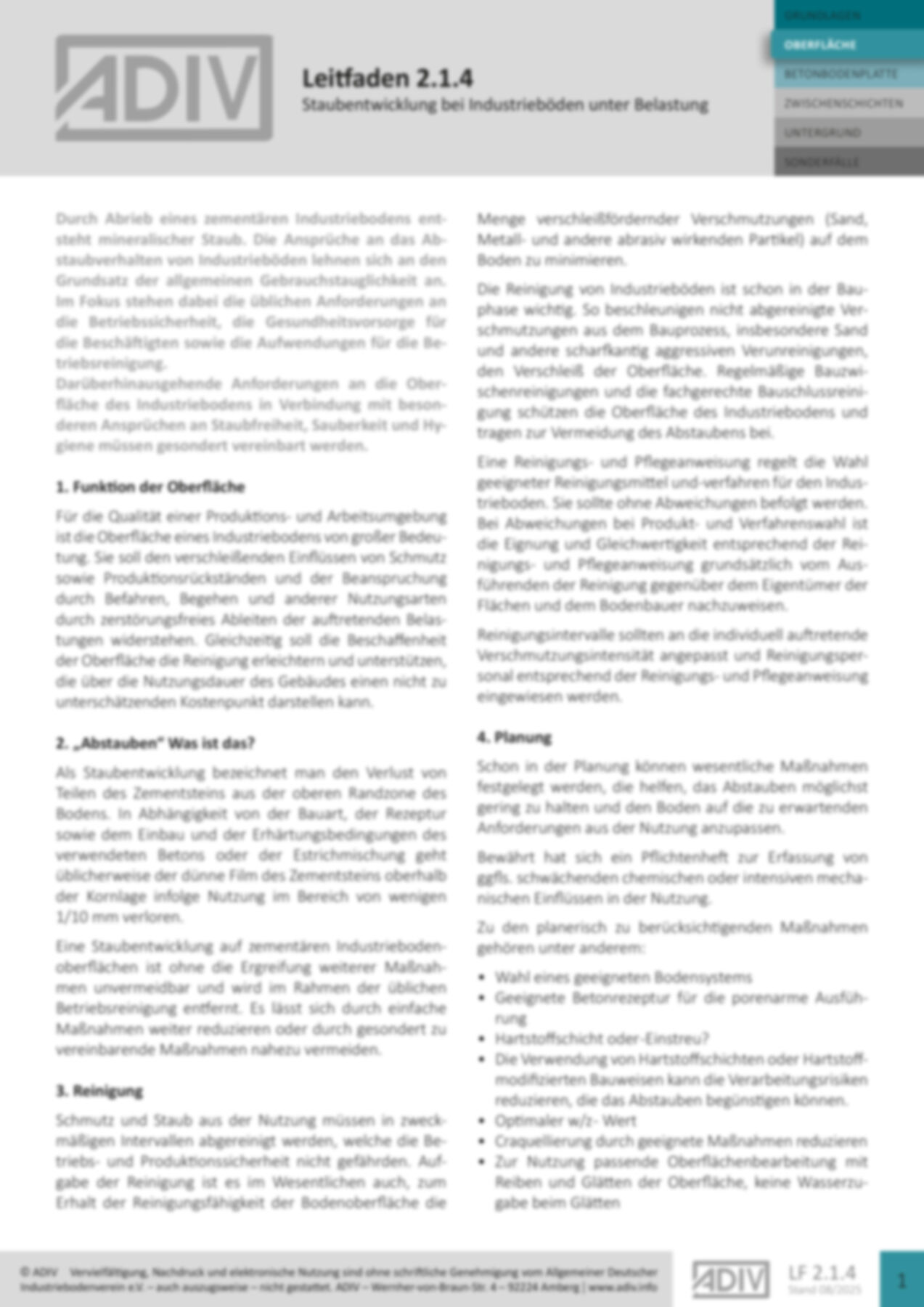Der Leitfaden 2.1.4 behandelt die unvermeidbare Staubentwicklung bei zementgebundenen Industrieböden und deren Auswirkungen auf Sicherheit, Gesundheit und Reinigung. Durch richtige Planung, Bauweise, Reinigung und Zusatzmaßnahmen wie Schleifen, Silikatisierung oder Versiegelung lässt sich Staub deutlich reduzieren. Ziel ist eine langlebige, sichere und hygienisch gut zu reinigende Bodenoberfläche.