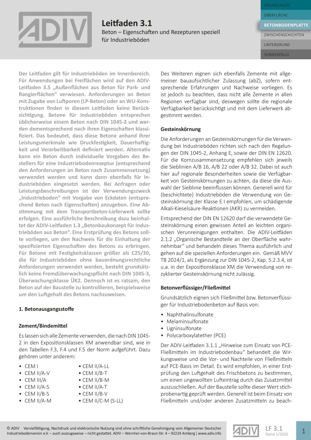 Der Leitfaden 3.1 behandelt die Eigenschaften und Rezepturen von Beton für Industrieböden im Innenbereich gemäß DIN 1045-2. Er beschreibt die Anforderungen an Betonausgangsstoffe wie Zement, Gesteinskörnung, Fließmittel und Fasern sowie die empfohlene Betonzusammensetzung. Zudem werden die Frischbetoneigenschaften wie Konsistenz, Luftgehalt und Blutneigung sowie die Festbetoneigenschaften wie Druckfestigkeit, Oberflächenzugfestigkeit, Verschleißwiderstand und Schwindverhalten detailliert erläutert. Der Leitfaden gibt Empfehlungen zur Belastbarkeit und Nutzbarkeit von Industrieböden und verweist auf weitere relevante Regelwerke und Merkblätter für spezifische Anforderungen.