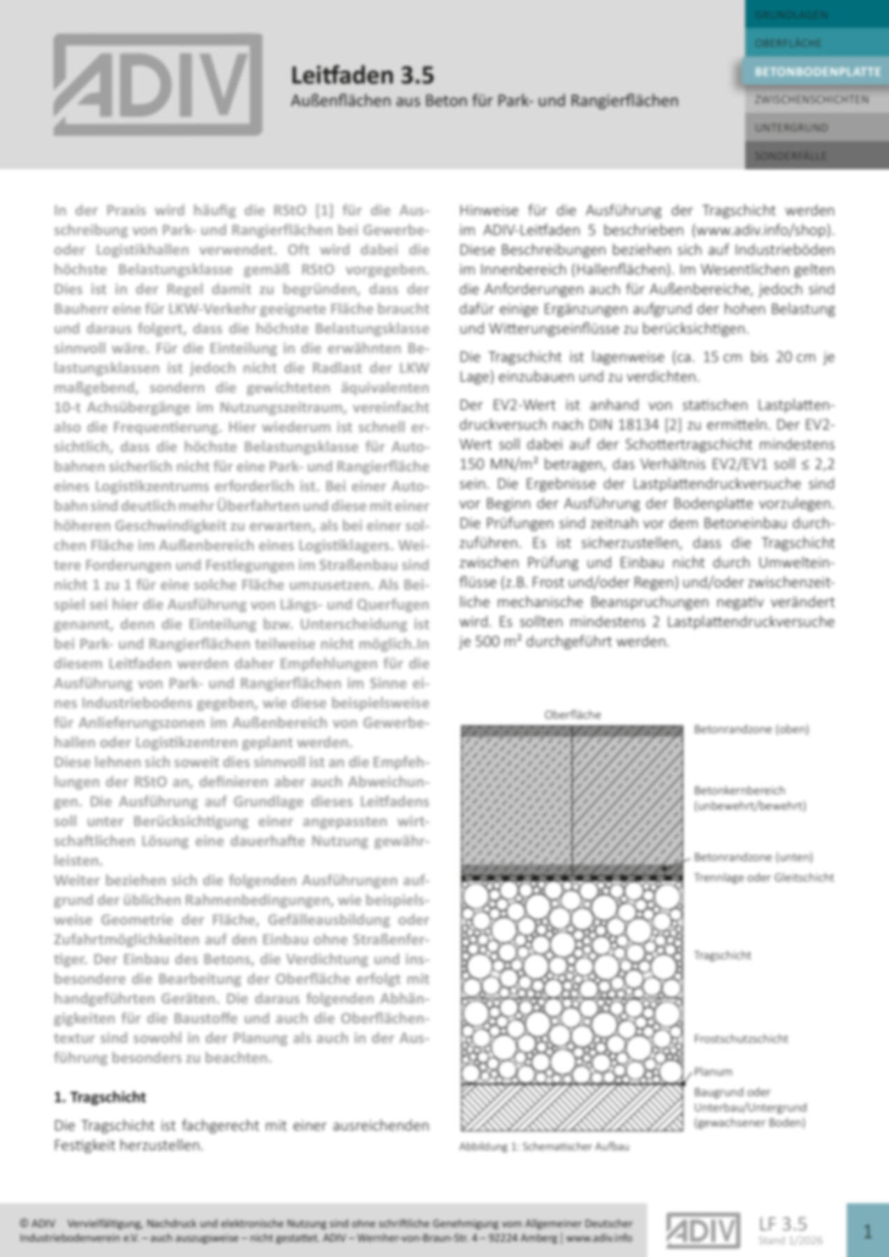 Der Leitfaden 3.5 bietet Empfehlungen für die Planung und Ausführung von Beton-Außenflächen für Park- und Rangierbereiche, insbesondere bei Gewerbe- und Logistikhallen. Er orientiert sich an den Richtlinien für die Standardisierung des Oberbaus von Verkehrsflächen (RStO), berücksichtigt jedoch spezifische Anforderungen wie Belastungsklassen, Tragschicht, Betongüte, Plattendicke, Fugenplanung, Oberflächenbearbeitung und Nachbehandlung. Besondere Aufmerksamkeit wird auf die Frequentierung, Witterungseinflüsse und die mechanische Beanspruchung gelegt, um eine dauerhafte Nutzung zu gewährleisten. Zudem werden Hinweise zur Ebenheit, Gefälleausbildung und den Einbau von Rinnen und Einbauteilen gegeben.